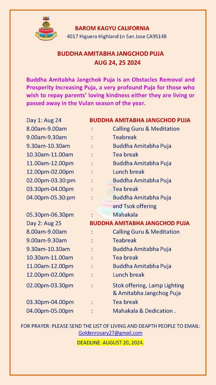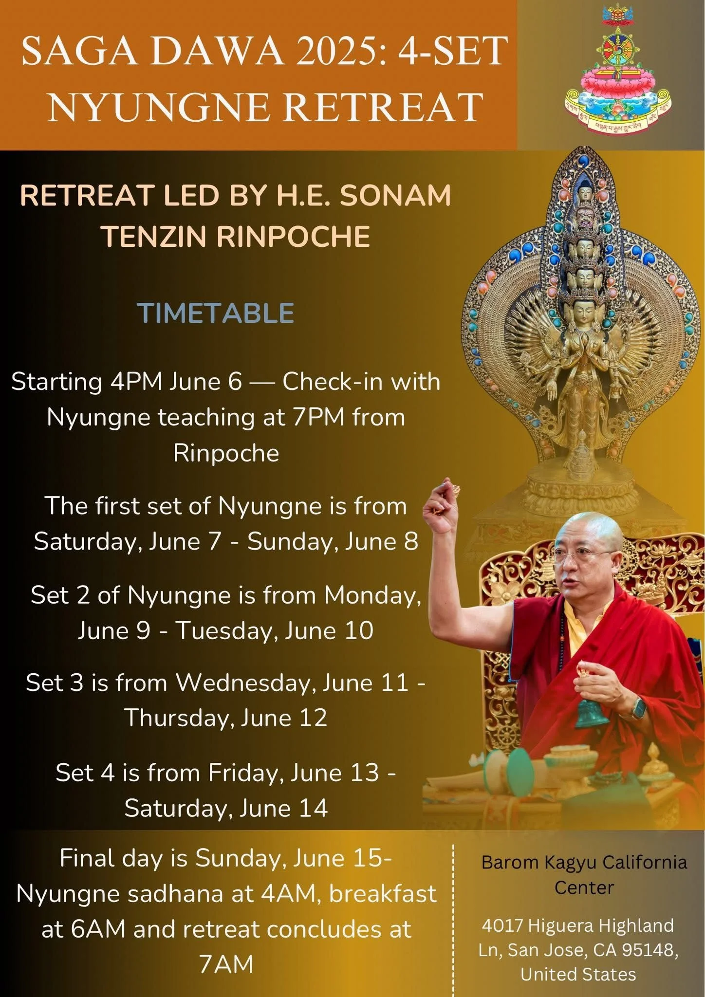 Location: Barom Kagyu Chodrak Choe Khorling Dharma Center, 4017 Higuera Highland LN San Jose, CA 95148